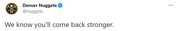 穆雷第一时间报平安,晒出自己受伤的图片给自己打气“你可以把斗士拖出战斗……但你永远不能夺走斗士的斗志。”掘金官方发推“我们知道你归来时会变得更强。”据统计本赛季掘金共打了54场比赛,其中穆雷共缺席了6场比赛,这6场比赛掘金仅取得3胜3负,胜率50%,场均得分112.8分;而在其出战的48场比赛中,掘金共取得31胜17负,胜率64.6%,场均得分115.2分。