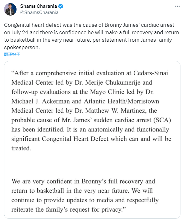 詹姆斯家族发言人更新布朗尼的最新情况,正式声明:在由Merije Chukumerije博士领导的Cedars-Sinai医疗中心团队、由MichaelJ.Ackerman博士领导的Mayo诊所团队和由Matthew W.Martinez博士领导的大西洋健康/莫里斯敦医疗中心团队的后续评估后,詹姆斯先生(布朗尼)突发心脏骤停(SCA)的可能原因已确定。这是一个解剖学和功能性显著的先天性心脏缺陷,。