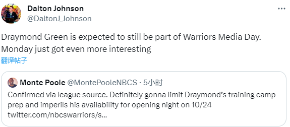勇士记者Monte Poole表示肯定会限制德雷蒙德准备训练营,并危及他在10月25日揭幕之夜的可用性;Dalton Johnson表示预计格林仍将参加勇士媒体日。