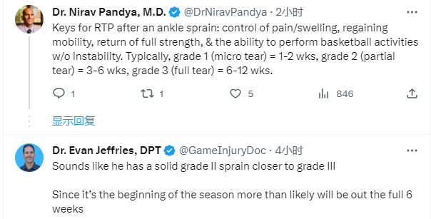 究竟格林会缺席多久?医学专家Nirav Pandya表示脚踝扭伤后的关键是控制疼痛/肿胀,恢复活动能力,恢复全力以及在没有疼痛的情况下进行篮球活动的能力;通常,1级扭伤(轻微撕裂)需要休养1-2周;2级扭伤(部分撕裂)需要休息3-6周;3级扭伤(完全撕裂)需要休养6-12周。