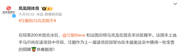 与马尔尚的傲慢相比,法国总统马克龙在混合采访区与汪顺握手的一幕也被现场观众拍到。赛后,汪顺表示自己已经用尽全部的能量没有遗憾,虽然没有达到目标但还是为自己的努力感到自豪。
