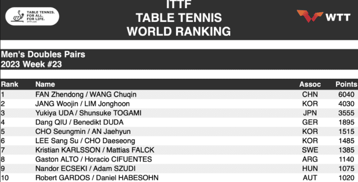 混双领域依旧是“莎头组合”王楚钦/孙颖莎第1,林诗栋和蒯曼位居第3。