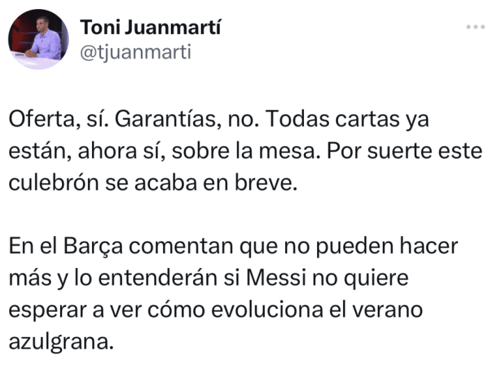 来源:360直播吧2023-06-07 11:32360直播吧06月07日在大巴黎官宣梅西自由身离队后,阿根廷球王未来去向,无疑是这几天全世界球迷最为关注的焦点之一。北京时间6月7日,来自加泰知名记者Toni Juanmartí的消息,尽管巴萨已经尽了一切努力,但他们现阶段无法保证能够注册梅西。