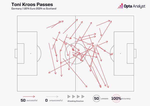 到了比赛中,克罗斯的表现极其出色而稳定,上半场开场第10分钟,维尔茨打进本届欧洲杯的首球,就是源自于克罗斯的长传球策动进攻,他在中线送出精准长传转移,才有了德国队的进攻破门。
