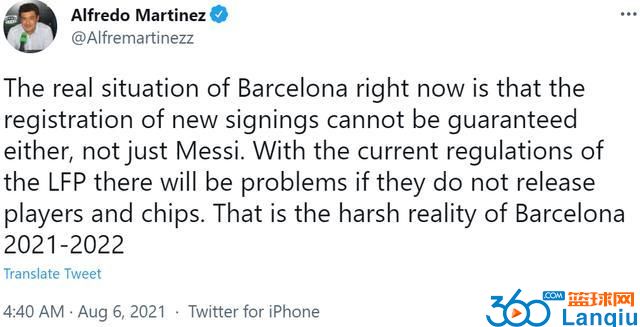 360直播吧讯 西班牙记者阿尔弗雷多-马丁内斯表示,巴萨现在的问题不仅仅是无法续约梅西这么简单,此前引进的新援现在还无法注册。